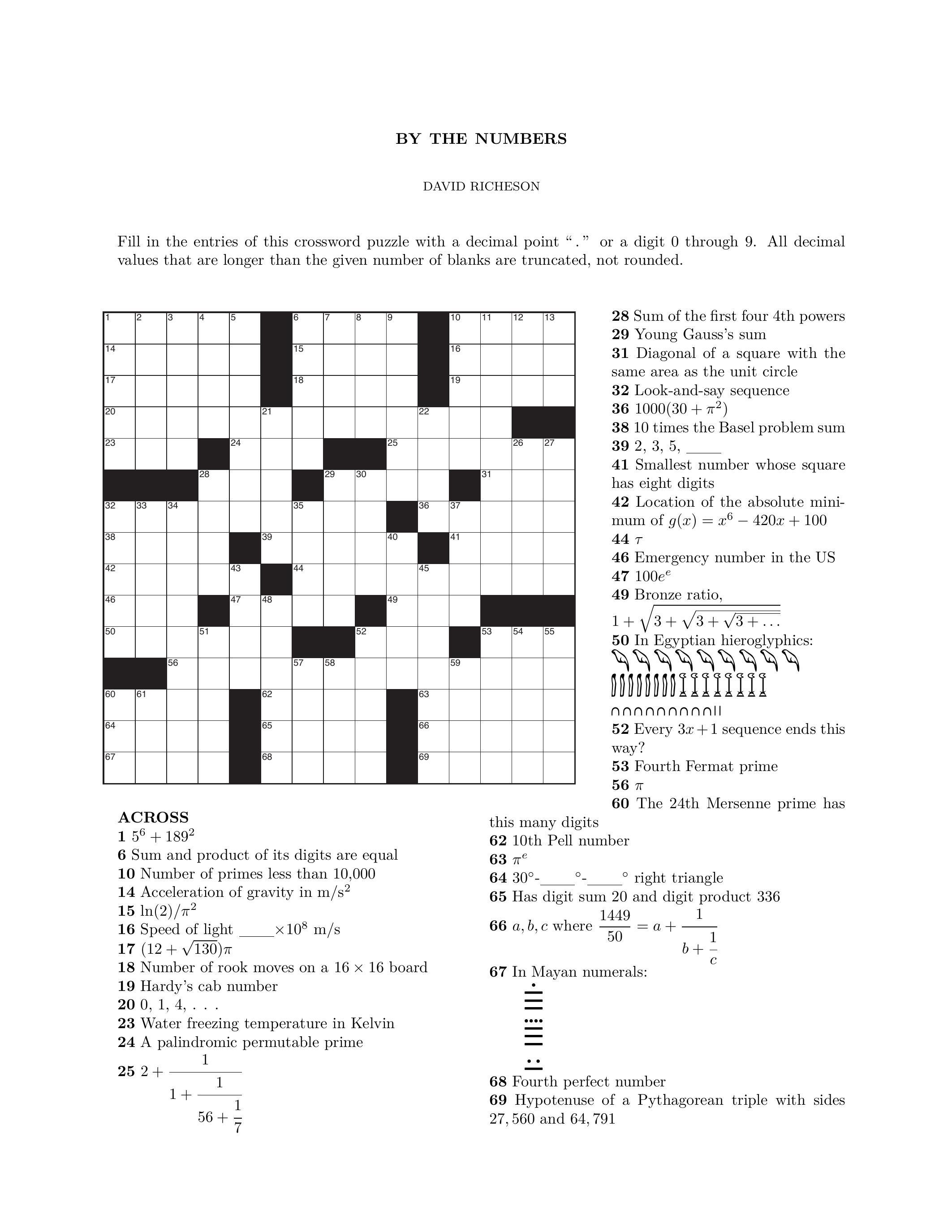 Here's a crossnumber puzzle by Professor David Richeson, Professor of Mathematics and the John J. Curley ’60 and Ann Conser Curley ’63 Faculty Chair in the Liberal Arts at Dickinson College. It's one of the best crossnumber puzzles I've seen besides my own out there, and incorporates a lot of mathematical topics that are a little out of the mainstream. I've recently solved the puzzle, and am going to comment on some of the clues below to show how solving a puzzle such as this can be an enlightening learning experience for all kinds of students and the general public.