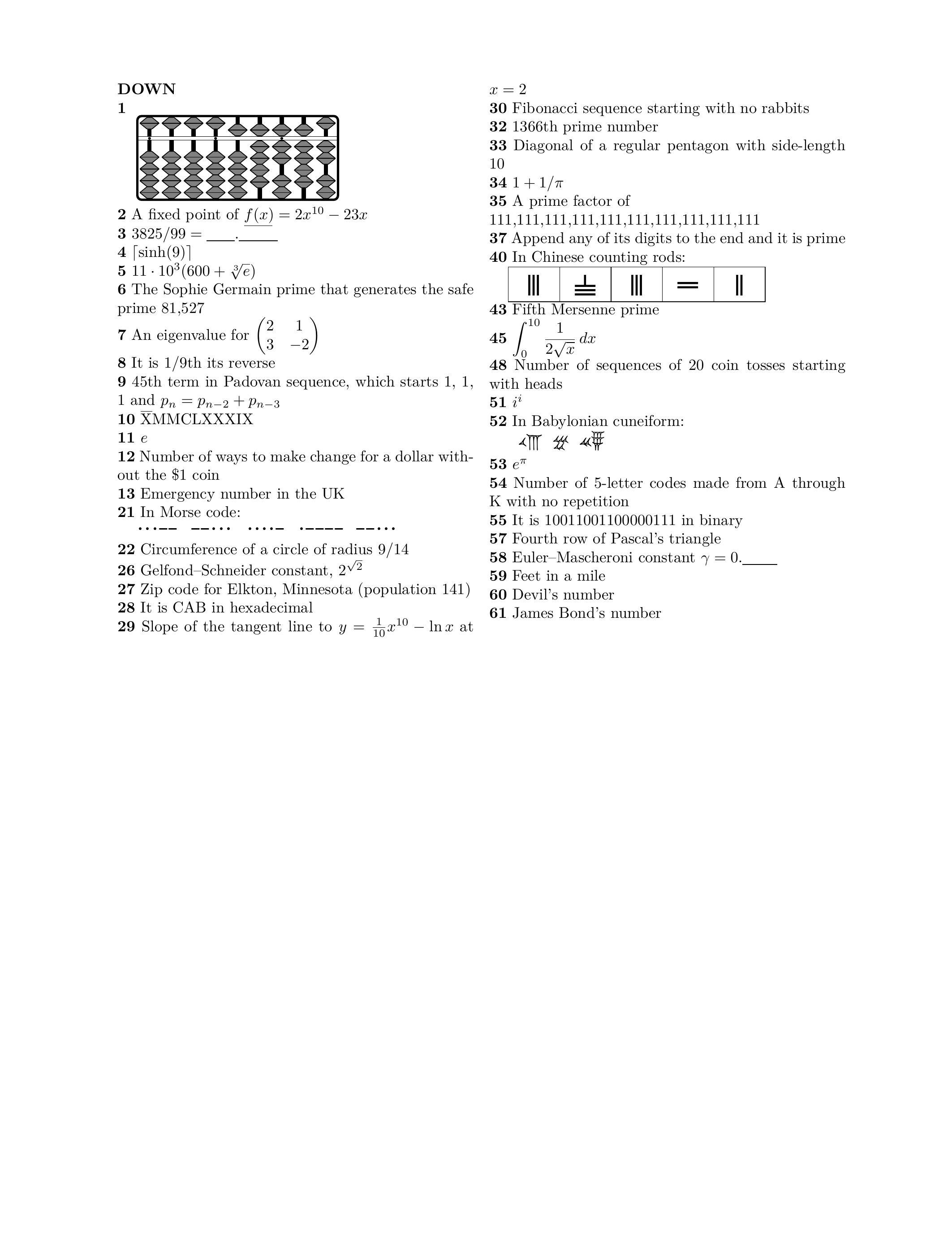 [I really like geometry problems as clues for crossnumber puzzles! The free version of PerplexityAI doesn't generate images in the result, but the links in the answer to my query show the images.] 32 Look-and-say sequence 361000(30+pi^(2))1000\left(30+\pi^{2}\right) 381010 times the Basel problem sum 392,3,5,2,3,5, ___ 41 Smallest number whose square has eight digits 42 Location of the absolute minimum of g(x)=x^(6)-420 x+100g(x)=x^{6}-420 x+100 44tau\tau 46 Emergency number in the US 47100e^(e)100 e^{e} 49 Bronze ratio: 1+sqrt(3+sqrt(3+sqrt(3+dots)))1+\sqrt{3+\sqrt{3+\sqrt{3+\ldots}}}